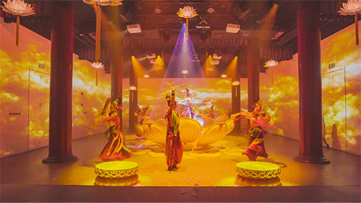 數十臺NEC哈勃系列液晶激光投影機,打造石窟數字影像復原展與天龍山劇院沉浸式展廳,通過數字影像還原石窟藝術,復原時代價值,用科技守護古典文物。天龍山石窟數字復原展國寶廳,以四面沉浸式CAVE數字展項精準復原天龍山海外流失造像,令國寶石窟的舊日盛顏得以再現。人文歷史的真實滄桑,亦伴隨著超清影像的虛實變幻,呈現得淋漓盡致。演藝劇場同樣借由哈勃系列強悍的多臺融合投影能力,打造出超大沉浸式CAVE空間,締造出極具視覺沉浸感的舞臺效果,打破現實與虛擬之間的次元壁,讓真人舞者與夢幻光影真正交織相融,觀眾沉醉于千年石窟的雋永魅力中,盡顯石窟藝術之美。