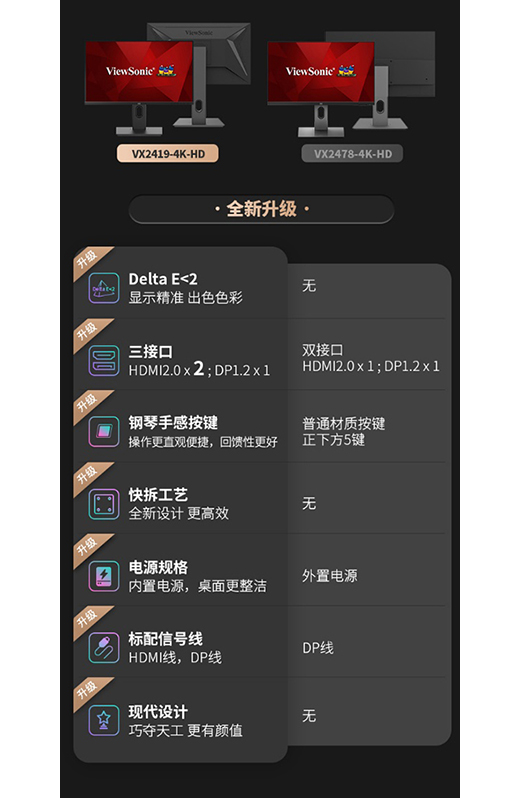 2;極具現代感的外觀設計,配有快拆工藝支架,安裝便捷,打造更高效的都市生活。鋼琴般觸感的手感按鍵,用戶操作更直觀便捷,回饋性更佳;方便用戶使用的升級,配有兩個HDMI和1個DP接口,并標配HDMI和DP雙信號線,搭載內置電源,更節省桌面空間,打造都市時尚新生活。