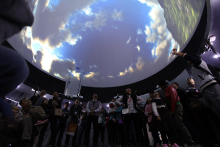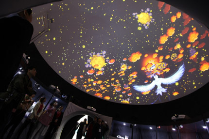 穹幕影院是寬銀幕發展到極限,轉而又向天空發展而成的一種產物。現今,雅圖卻將它賦予了更深刻的內涵,它將多通道數字多媒體投影技術、數字及光學幾何校正技術、邊緣融合技術、高清影片分布式播放技術等一系列高新技術與現代藝術完美融合。在7米直徑,周長22米球體內部,運用多臺雅圖高清工程投影機、5.1立體音響系統來實現360°雙圓周裸眼3D穹幕實現全沉浸式體驗。