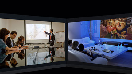 連接工作與生活,多面角色自由切換。同事們出差在外,難免會出現需要緊急討論修改方案的情況,隨手拿出激光微型投影儀,清晰地在白墻上打出所要討論的PPT,經過一番激烈的討論,大家很快在這個臨時的會議室里得出了更好的方案。回到家中,最近上映了新的大片,電視不夠大?沒問題,激光微型投影儀,最大可以投射300吋。客廳有多大,視界就有多大。