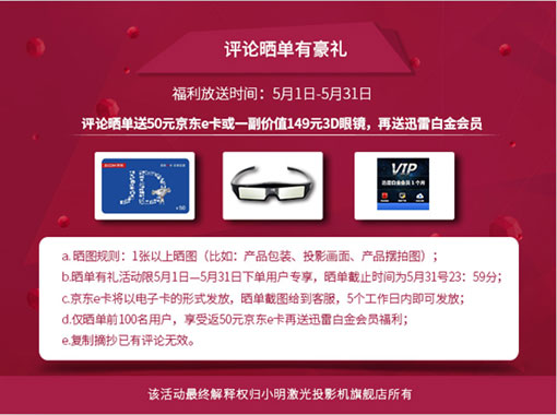 2, 評論曬單送50元京東e卡或一副價值149元3D眼鏡,再送迅雷白金會員;