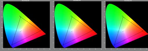 中圖:這是柔和模式下的測量結果,整個色域范圍、白點位置與標準模式接近,但準確度沒有標準模式高
