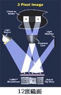 DLP投影機的主要呈像部件為DMD(數字微鏡芯片),其呈像原理是燈泡發出光源,經過聚光凌鏡集中成為點光源,穿過快速旋轉的色輪,色輪中的紅、綠、藍各區間只容許相同顏色的光線通過,藉此將光線分成色彩的三個原色,在不同時間段將紅、綠、藍的光線照射在布滿數十萬微鏡的芯片上,微鏡以正負轉動10度的方式,將所需光線擷取反射到鏡頭中,將不要的光線反射到鏡頭外,以此組合成畫面中每一點所需的顏色,將各點組合起來就成了我們所看到的影像。