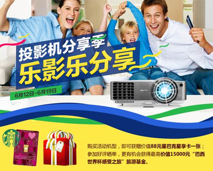 去不了巴西世界杯?不用羨慕!明基家用投影機(jī)帶你輕松感受激揚(yáng)賽場,客廳就是你的專享VIP賽場!沒錯,伴隨家用投影機(jī)日趨大眾化,今天的你可以輕松擁有客廳影院,讓全家老小一同分享震撼大屏高清體驗(yàn),甚至還能移動便攜,將大尺寸影院隨身帶著跑!適逢618網(wǎng)購狂歡節(jié)即將來臨,擁有業(yè)內(nèi)最完整家用產(chǎn)品線的明基BenQ現(xiàn)已啟動“投影分享季