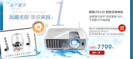 由明基京東聯合打造的i701JD智能無屏電視,是劃時代的多功能一體化家庭娛樂解決方案。它整合明基專業1080P全高清DLP投影技術,搭載安卓操作系統,內建強勁4核CPU、8核圖形處理器,支持無線WIFI連接,甚至提供數千部好萊塢正版高清影視片庫及包含音樂、游戲、海量應用在內的各種免費資源。一臺明基超大尺寸智能無屏電視就可滿足全家娛樂需求!現冰爽特價7799,加贈玲瓏剔透、極致動聽的哈曼卡頓III代水晶音響。如參與好評曬單,再送價值千元3副原廠3D眼鏡。