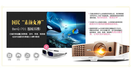 你說,要找的女朋友一定要胸大腿長容顏美,連這座城市都忍不住要翻白眼,誰又不是呢?子曾曰過,食色性也;子曾經(jīng)還曰過,無顏呵呵噠,有顏么么噠。明基i700是由因為本色所以更出色的DLP投影機(jī)全球銷冠——明基BenQ聯(lián)手阿里巴巴集團(tuán)下TV事業(yè)部推出的一款具備原生1920×1080全高清分辨率、配備6段式6倍速RGBRGB純色系色輪、擁有2200流明高亮度以及10000:1的對比度的智能高清專業(yè)家用投影機(jī)(能一口氣讀完的,肺活量超贊),目前已通過美國ISFccc權(quán)威色彩校準(zhǔn)認(rèn)證,色彩精準(zhǔn)度也符合Rec.709廣色域標(biāo)準(zhǔn),投影畫面的色彩表現(xiàn)堪稱完美。明基i700還特采用短焦和1.3倍變焦鏡頭,僅需短短1.5米距離,就能打造出100英寸以上的超大畫面,讓你居家也能享受到媲美IMAX影院的震撼畫面體驗。最特別的是,明基還首度將阿里YunOS操作系統(tǒng)無縫集成于i700中,搭配安卓四核、8G大容量閃存和無線WIFI模組,無需其它多余的設(shè)備,將可獲得海量正版的影音、游戲、教育、購物等高清點播資源,讓宅時光豐富起來。