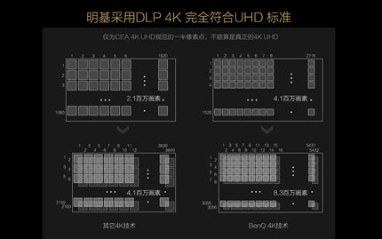 當然,更引人矚目的還是明基投影機于今年9月推出的4K投影機。雖然4K電視已經相當普遍,但是把4K技術應用在大屏方案上的還比較少。而其中有一些4K產品更是將1080P高清畫面的207萬個像素,通過位移提升至415萬像素,畫面雖然會細膩一些,但是比起真正的4K投影機還是差很遠。