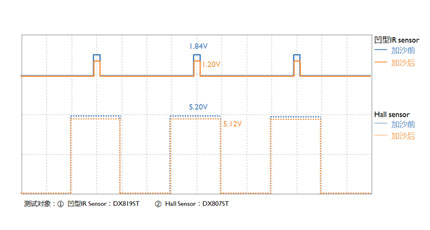 為了證實磁感應色輪的防塵性能,我們做了專門的驗證試驗。分別在色輪傳感器上方開孔,各加入1g關東沙,凹型紅外感應色輪的脈沖信號由最初的1.84V下降到1.20V,下降近34%,投影畫面開始出現閃屏;而磁感應色輪的脈沖信號由起始的5.20V下降到5.12V,下降了1.5%,投影畫面幾無影響。此外,當加到5g關東沙后,傳統凹型紅外感應色輪已經難以轉換出明顯脈沖信號,而磁感應色輪即使加到40g以上仍有脈沖信號顯示,投影機照常運作,防塵性能足足提升了8倍有余!