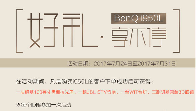 7月24日至31日,上京東購明基激光超投電視i950L可享四重豪禮大放送,下單就送一塊明基100英寸黑柵抗光屏、一組JBL