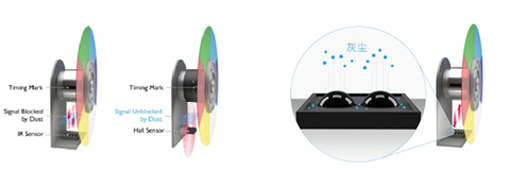 一是改用磁力感測的磁感應色輪,利用霍爾效應偵測磁場密度變化來判斷色輪轉動,不再受到積灰影響,同時磁感應色輪響應速率高達100W