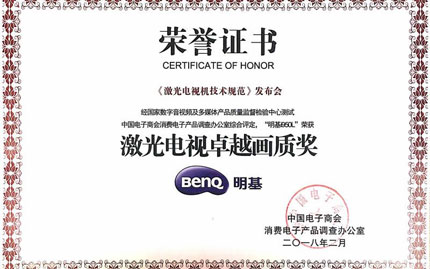 與此同時,明基認為畫質標準是激光電視需要規范的重點。畫質包括分辨率、亮度、亮度均勻度、可視角、色彩等,構成的整體視覺效果。夠大還要夠清晰,色彩還要真實,才是真正的大屏享受。送檢的明基i950L激光超投電視,在色彩、分辨率等方面表現優異達A+標準,給消費者帶來驚艷的觀看體驗,獲得主辦方頒發的“畫質卓越獎”殊榮。