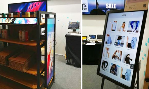 智能貨架的右邊是商顯屏與X-sign 2.0結(jié)合的軟硬件一體化的虛擬貨架方案適用于各零售場景。