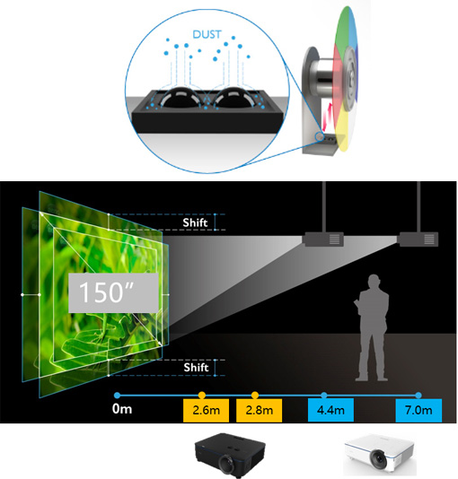 穩定耐用是工程投影機的重要競爭力!明基激光工程投影機LU95系列采用激光光源實現20000小時使用壽命,無需更換光源。更重要的是,其通過了IP6X防塵測試,穩定運行更有保障;這得益于兩大優勢技術——全封閉光機與凸面造型色輪傳感器,它們不僅阻隔灰塵進入光路系統,大幅減少色輪積灰情況,從根本上解決了灰塵引發色輪傳感器失效、畫面出現斑點、色彩嚴重衰減等頑疾,從此,客戶無需再擔心投影機突發故障與維護昂貴。