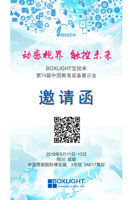 2018年5月11日-13日,BOXLIGHT寶視來盛裝亮相第74屆中國教育裝備展示會,期待合作伙伴與教育行業(yè)友人蒞臨四川成都中國西部國際博覽城3號館3A017展位。