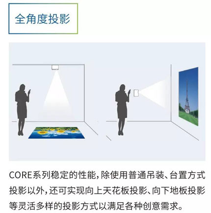 卡西歐新光源投影機CORE系列特點,包含型號XJ-VC330XS、XJ-VC270和XJ-VC110。該系列特點包括:激光+LED混合光源、大尺寸(30-300寸,相同高畫質體驗)、1.5倍光學變焦(VC330XS)、全角度投影、無水銀環保新光源(不含有害物質汞)、5秒開機0秒關機、10.7億色色彩表現、精心設計的防塵結構、長壽命(10年)和低功耗等。