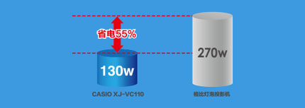 卡西歐投影機(jī)從2010年開(kāi)始即不使用燈泡,采用激光+LED的混合光源,使得功耗大大降低,減少了后期使用時(shí)的電力成本。這款XJ-VC110投影機(jī)功耗僅為160瓦,相比傳統(tǒng)的燈泡投影機(jī)省電高達(dá)55%。在具備節(jié)能環(huán)保的優(yōu)良特性的同時(shí)依然保持了3000流明的高亮度,在白天環(huán)境光較強(qiáng)的情況下依然清晰可見(jiàn)。分辨率為1024×768(XGA),同樣支持5秒快速啟動(dòng)和光學(xué)變焦。