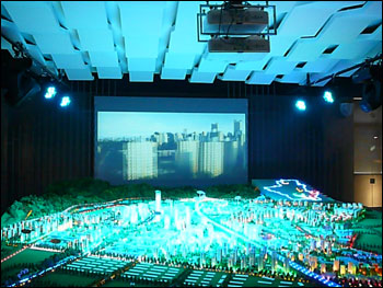 步入多媒體展示廳,映入眼簾的是一組巨大的昆明泛亞科技新城沙盤,流光溢彩的沙盤展示令到場的人們驚嘆不已,紛紛駐足觀賞。林立的高樓、穿梭的汽車以及優美的綠化布滿整個沙盤。順著沙盤看去,眼前是一塊鮮亮清晰的互動投影幕布,循環播放整體園區的布局展示。人們會在沙盤中看到自己工作的辦公地點或是途徑的街道,不禁會為同行的親朋好友介紹一番。這時,大家會驚奇的發現當我們觸摸沙盤中某幢大樓的時候,投影幕布上便會實時顯示出有關該大樓的外景鳥瞰圖,隨后,視線便被吸引到樓內,3D效果圖展示全方位的戶型布局和家裝效果,配以詳盡的參數資料,從立體到平面地為人們帶來完整展示,突顯昆明泛亞新城領先的工作生活環境。