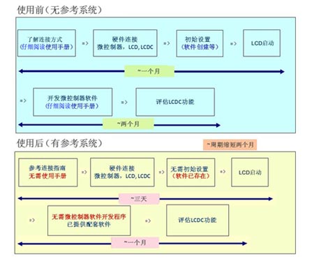 在為工廠自動(dòng)化、測(cè)量、醫(yī)療、商業(yè)及其它特殊應(yīng)用開發(fā)配置中小尺寸液晶面板的產(chǎn)品時(shí),顧客必須將顯示控制器芯片、微控制器和液晶面板一一連接后,再運(yùn)行評(píng)估并優(yōu)化設(shè)置。然而,運(yùn)作這一流程顧客必須閱讀大量相關(guān)使用手冊(cè)并針對(duì)上述組件開發(fā)定制的銜接軟件,這無(wú)疑將耗費(fèi)大量時(shí)間和資金。