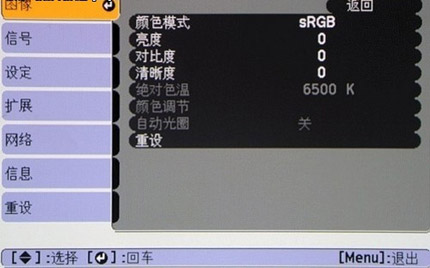 愛普生EB-CS520WN投影機,菜單設置也是十分豐富,用戶不僅可以完成圖像、信號、設定、擴展、網絡、信息以及設置7大項供用戶調節,還可以輕松完成信號源的選擇。此外,該機在圖像模式中內置了多種預設模式,對于入門級用戶或者需要快速演示時通過選擇相應的模式,即可完成快速設置,非常方便。而用戶同時可根據自行需求進行手動調整亮度、對比度以及清晰度。愛普生EB-CS520WN投影機