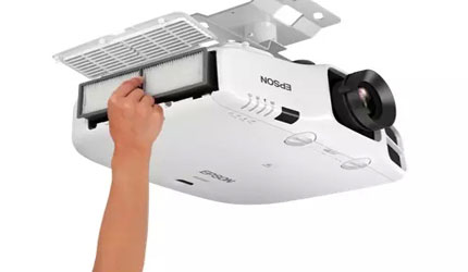 學校配備的愛普生投影機,能夠有效防止灰塵進入,大幅延長使用壽命。其側蓋的散熱欄內加入了高效靜電型空氣過濾網,褶皺設計增大了空氣過濾網的表面面積,在靜電作用下加大了對細小灰塵微粒的吸附能力,可有效阻止小到0.3微米的顆粒,8微米大小的灰塵顆粒阻止率高達99%,因此通過高效過濾網過濾后的空氣得到了凈化,即使在惡劣環境下使用,仍能保持機內清潔,防止投影機發生如亮度下降等一系列問題,為投影機的正常工作提供了充分保障。