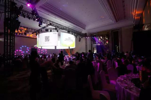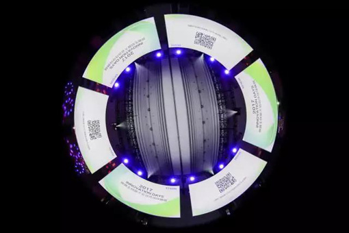 創(chuàng)新大會(huì)晚宴現(xiàn)場(chǎng)的這一雙面弧幕投影,就成為了當(dāng)日的焦點(diǎn)之一。6片弧形長(zhǎng)方形屏幕組成一個(gè)圓形“陣列”,屏幕內(nèi)外雙面均可看到投影內(nèi)容。該圓形“陣列”懸掛在圓形舞臺(tái)上方,大小、方位都非常適宜,既奪目別致,又不會(huì)擋住舞臺(tái),是非常適合酒店宴會(huì)演出的設(shè)計(jì)。