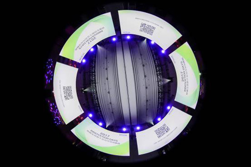 創(chuàng)新大會晚宴現(xiàn)場的雙面弧幕投影方案,真的是搶走了各位大長腿小姐姐的風(fēng)頭。6片弧形長方形屏幕組成一個圓形“陣列”,屏幕里外雙面均可看到投影內(nèi)容。這個圓形“陣列”懸掛在圓形舞臺上方,大小、方位都非常適宜,既奪目別致,又不會擋住舞臺,簡直就是專門為酒店宴會廳而生的解決方案啊。
