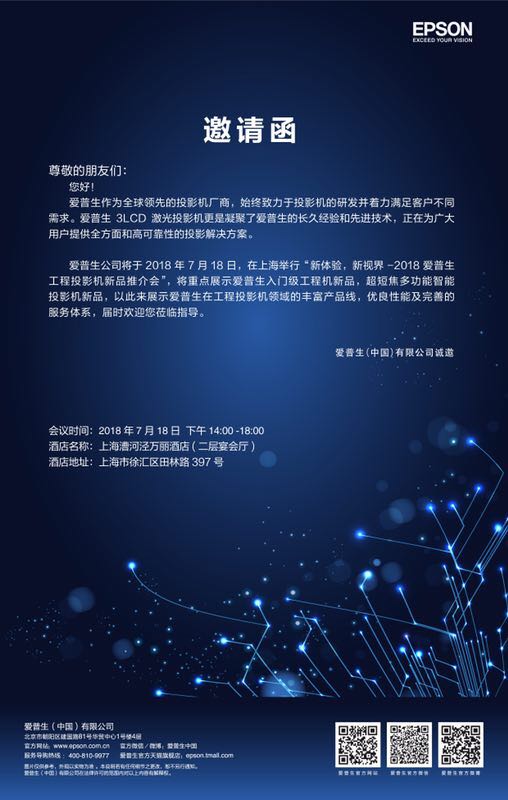 [投影之窗消息] 2018年7月,EPSON 在全國范圍內(省會城市)舉辦EPSON工程投影機新品推介會,屆時全線EPSON 工程投影機、投影燈新品、及其各類解決方案將悉數亮相。