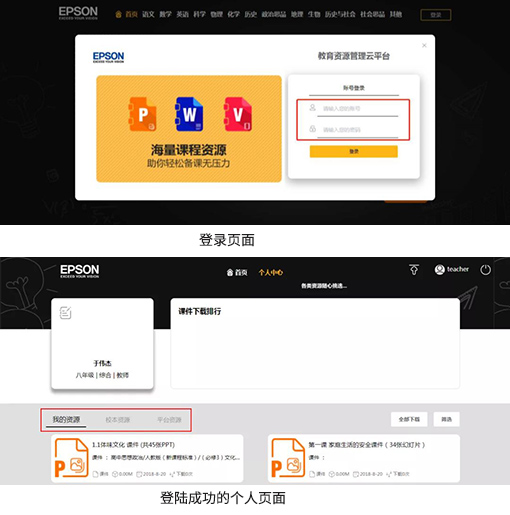 愛普生K12課件資源云平臺可以幫助教師用戶個體以及學校用戶群有效地管理和分享課件資源。用戶只需點擊登錄按鈕,登錄自己的賬號,即可登錄系統,進入個人中心頁面,建立自己的課件資源庫。遇到心儀的課件資源,除了保存在電腦本地外,也可以在線收藏在自己的資源中心,以便隨時隨處查看。如果覺得課件優質值得分享,還可以下載至“校本資源”,這樣,同一個學校的老師們都可以受益于優秀的課。