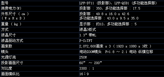 | 2005年1月,日本富士通利用Epson開發的D4型片上全HD面板“L3D13U”推出了HTPS技術的實現HD(1,920 x 1,080)解像度的正投影:LPF-D711。面板尺寸為:1.3英寸面板的開口率為:58%,LPF-D711的標稱對比度卻達到了:3,300:1;其最高亮度輸出為:1200流明。產品采用了分體設計,主投影器的定價為:$18,000美元。視頻控制器的定價為:$7,000美元 |