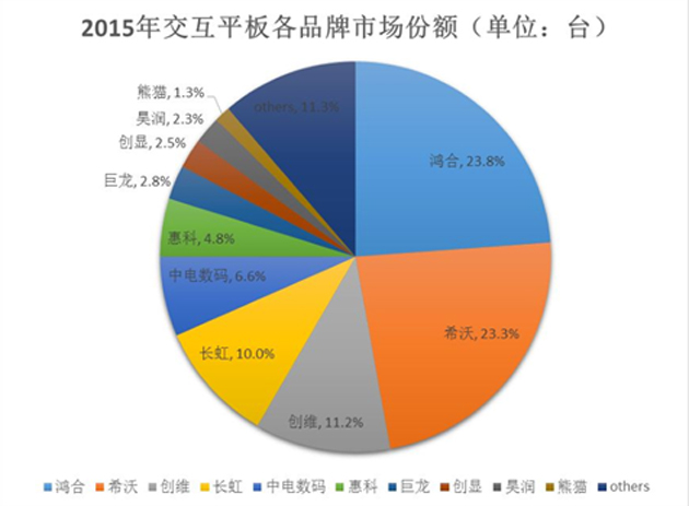 23.8%的市場份額,連續(xù)三年領(lǐng)跑國內(nèi)市場;希沃緊隨其后,占比23.3%;創(chuàng)維則在2015年完成對長虹的逆襲,以11.2%的市場份額,排在第三位;長虹僅次于創(chuàng)維,占比10