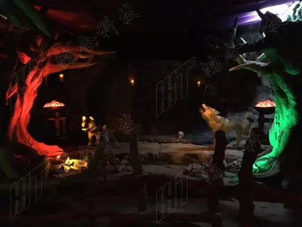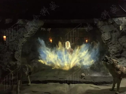 當游客走過冥河,觸發(fā)紅外開關,投影機將影像投射在兩邊的布景上,各種恐怖影像接踵而至,結合現(xiàn)場實景,感覺不能更真了。