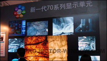 在三菱展臺上最為顯眼的就是由四塊67英寸70系列DLP背投顯示墻拼接而成的巨大顯示畫面。擁有智能、靈活、內置處理器、自動平衡、安裝簡便、耐久以及備份7大特性的70系列DLP背投顯示墻,是今年度三菱推出的具有開創性意義的最新DLP背投顯示墻產品。以人性化、智能化作為設計主概念,三菱70系列產品代表了拼接墻產品發展的新前景及方向,而本次展示的產品中另有一款67英寸前維護的產品,空間上的節省及便利的維護為人們選擇大型顯示設備提供了更好的選擇。