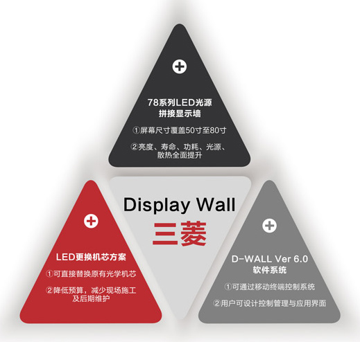 由于全球發展戰略因素,三菱將拼接墻產品作為其專業顯示業務的重點,于2014年發布了最新一代LED光源背投拼接墻、LED更換機芯及D-Wall