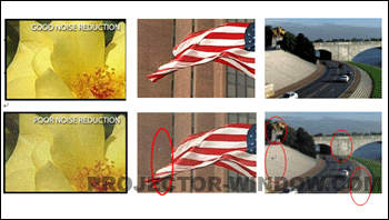 從左至右上下組畫面分別反映了HQV的降噪、動態像素的消除各行和細節增強功能 |