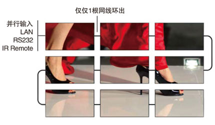 三合一控制菊花鏈設計最大可支持100臺(10×10)顯示器的拼接,控制信號通過一根網(wǎng)線環(huán)出,既減少連接線纜也降低了人力成本。獨有的幀同步功能保證拼接墻畫面在高速運動時,拼接單元之間畫面的同步性。