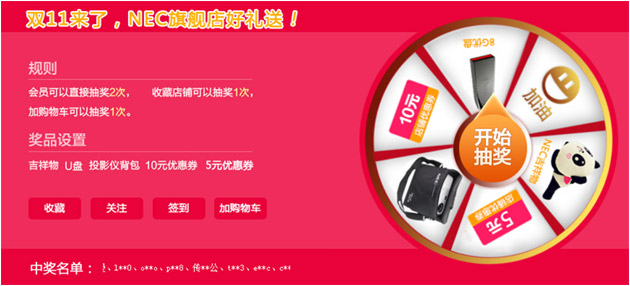 U盤、背包和優惠券好禮抽不停!天貓會員登錄天貓NEC旗艦店首頁即可獲得2次免費抽獎機會并且是100%中獎哦!注意,是100%哦!什么?沒抽夠還想繼續......OK,沒問題!只要您小手一抖收藏天貓