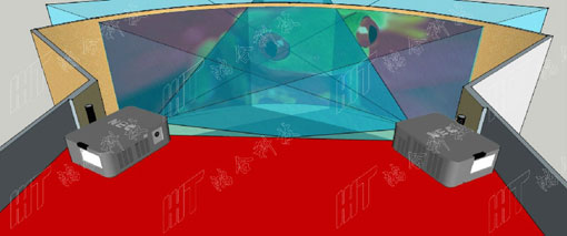 香港歷史3D影廳內采用一臺NEC NP-PX803UL-BK+投射弧幕3D,通過3D紅外發射器及3D主動立體眼鏡實現3D效果。