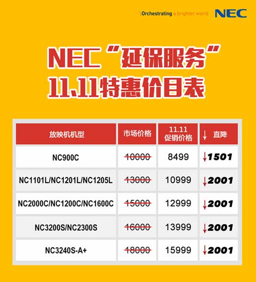 首批購買單色激光放映機的小伙伴們,小N喊你來購買延保啦,為您的放映機增加一道保護傘,保障它正常運行,解除您的所有顧慮。真正的福利是讓您享受高品質的同時,還能享受最優惠的價格!此次雙11期間,NEC單色激光放映機迎來了首次延保促銷,折扣低至85折,最高直降2001元!
