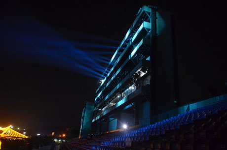 3座高塔的投射距離差別大,其中兩座側塔的投射距離達到210-230米,同時要保證每座高塔顯示相同質量畫面,給項目實施帶來很大難度。6臺DLP技術NEC