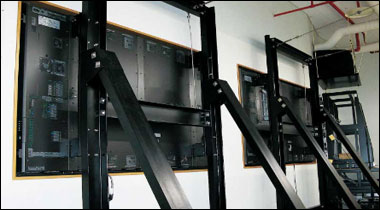 這些網(wǎng)絡(luò)源發(fā)出的信號通過切換器發(fā)送到防災(zāi)本部工作室的兩臺松下103寸等離子監(jiān)視器、播放文字信息的大型LED播放設(shè)備及各個作為上的PC,本部辦公室側(cè)面墻壁上的CRT監(jiān)視器等大量影像播放設(shè)備。切換器距等離子監(jiān)視器約60米,采用DVI光線電纜,以免因遠(yuǎn)距離傳輸造成的視頻信號弱化,或受到各種機(jī)器發(fā)出的電磁波等噪音干擾。這些視頻輸出設(shè)備建立系統(tǒng),通過本部辦公室內(nèi)及操作室的觸控面板操作,所需信息可瞬間簡單切換。同時引進(jìn)畫面合成設(shè)備,可將一臺監(jiān)視器畫面分割,或多種影像同時播放,最大程度的靈活使用103寸大畫面。