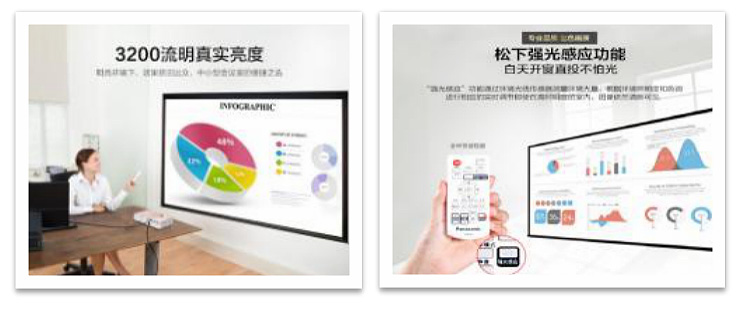 便攜新品系列同樣配備松下獨有強光感應功能,內置的光線傳感器可根據投影環境的明暗變化自動調整投影畫面亮度、對比度和色調,保障投影畫面明亮清晰、色彩飽滿,為用戶提供高畫質的視覺享受。