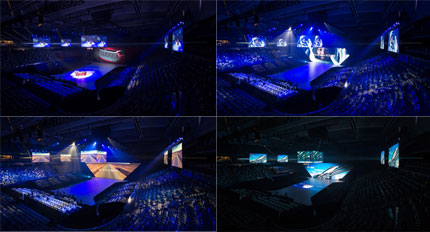 本次比亞迪品牌之夜活動采用10臺30,000流明的PT-SRZ31KC松下激光工程投影機,投射畫面左右橫跨上海東方體育中心,其中7臺單打10.6×6米高空中的7塊大屏幕,單打亮度堪比LED,3臺全部投射地面并進行邊緣融合,呈現超大畫面的震撼效果。