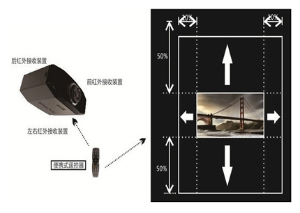 位移和垂直50%位移電動調節。全功能遙控器,4個角度的紅外接收裝置,利用遙控器直接對投影機或屏幕進行操作投影機各種功能。