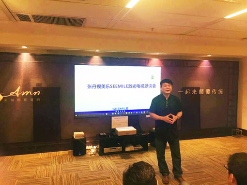 視美樂在CIT展會組織了兩場《張丹SEEMILE激光電視懇談會》,參加的人流絡繹不絕。張總首先回顧2015年行業的發展情況,特別是激光技術逐步成為投影行業關注的新熱點,同時亦深受各品牌看好的新光源種類。隨著激光技術的成熟,經過近兩年時間的厚積薄發,激光電視從墻后的研發終于走到市場的前沿,讓投影工業看到了廣闊的發展空間。激光光源集優異的色彩還原、高解度的圖像、優異的穩定性等多種優勢,透過商務應用大行其道之后,業已逐漸進入民用領域!特別在中高端影音市場成為新的佼佼者。