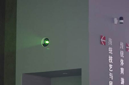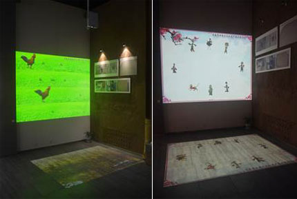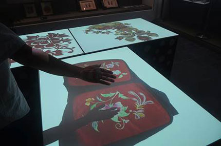 在手工藝展區,“剪紙”和“刺繡”都是重要展項,巧奪天工的各類剪紙和刺繡作品讓人大開眼界,大多數作品尺寸較小,以精致細膩為亮點,而且還要收藏保存。如何能夠仔細鑒賞這些精巧的作品呢?展館應用了互動桌面投影系統,三臺索尼VPL-F500X投影機吊置安裝,將剪紙畫面垂直投影在特制的“桌面”上。應用這一系統,剪紙與刺繡作品的細節毫厘畢現,讓人們仔細觀賞。并且,這一系統還增加了交互功能,人們可以像翻書一樣,隨意欣賞豐富的剪紙與刺繡作品。