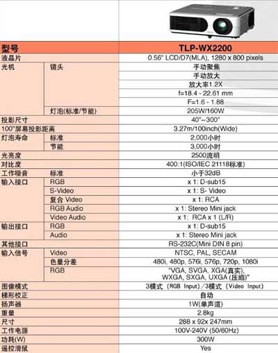 據了解,在16:9和16:10兩種寬屏投影顯示格式中,只有16:10的投影機才能完整的顯示出寬屏筆記本的畫面,它才能稱的上是真正的寬屏。東芝TLP-WX2200是東芝的第一款寬屏機器,也就是我們所說的真正的寬屏。它采用16:10的寬屏顯示比例,1280