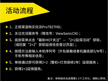 即日起凡正規渠道購買Pro7827HD產品,通過關注ViewSonic優派科技(ViewSonicCN)微信服務號進行簡單序列號相關信息注冊,即可享受2+2延保服務,即2年整機質保+2年燈泡質保的超值安心保障,且燈泡無使用時間限制。