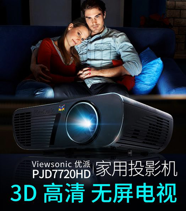 3D眼鏡,便可即時盡享藍光3D之美;投影機可做垂直梯形自動校正,投影機位置擺放靈活,無需擺放在正中位置,方便用戶的使用。此外,優派提供最亮模式、動態模式、標準模式、ViewMatch模式和電影模式5種色彩模式,以滿足不同環境的最佳觀賞色彩情況,時刻保持高質量的畫面呈現。PJD7720HD的平滑動態投影效果,亦能讓用戶在體驗游戲的過程中,享受游戲帶來的無限樂趣,是一臺理想的家用3D高清無屏電視。