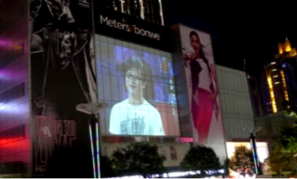 2013年夏季,重慶觀音橋商圈的市民發現美特斯邦威大廈的外墻,沒有改變結構,沒有安裝LED等設備,卻瞬間變為一個巨大而清晰的熒幕,播放著《中國好聲音》、《新聞在線》、體育等電視節目和商業廣告,畫面流暢清晰,周圍群眾紛紛駐足觀看。有的朋友都驚呼:“這簡直的就是魔術啊,從來沒見過這么大,這么清楚的電視,現場感好強呀,看足球比賽特別帶勁。”為此,小編做了一番探訪,發現原來是Vivitek麗訊實施的戶外長期安裝的外墻投影秀,采用的是其高端工程機D8900,她開拓了一個全新的商業廣告模式。