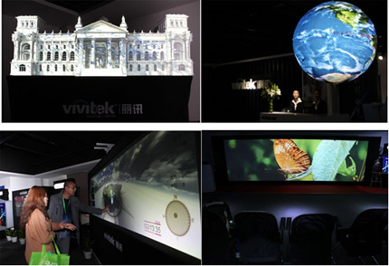 在2013年Vivitek麗訊工程機的精彩表演中,哪一次是展示技術最為全面的呢?小編認為這一定要屬4月1日Vivitek麗訊開展的首次工程機應用案例展示會——《投影的藝術》。在這次活動中,Vivitek麗訊利用D8800、D6520、D6515等多款工程投影分別帶來了外墻投影演示、多通道巨屏拼接演示、球幕投影、3D投影、數據可視化系統等多項技術的集中展示,全面體現了Vivitek麗訊工程投影的技術優勢和豐富的產品線,進一步拓展了工程領域的渠道建設,讓廣大工程領域用戶充分見證了Vivitek強大的技術實力與行業優勢。